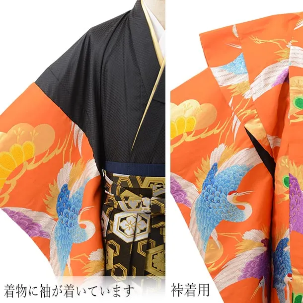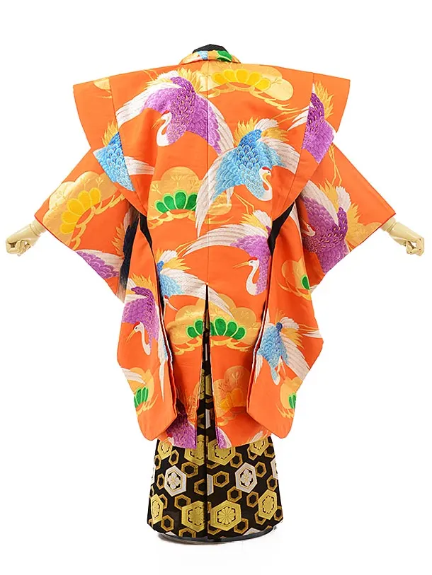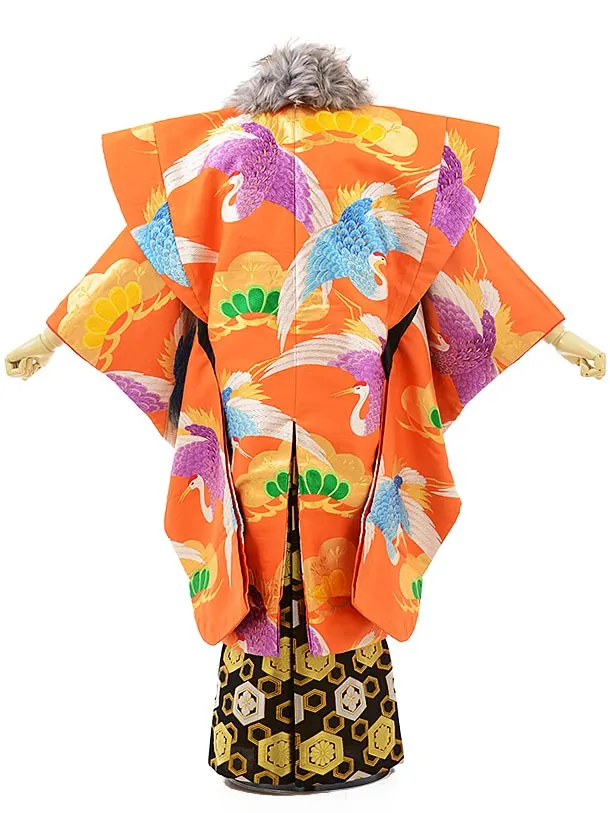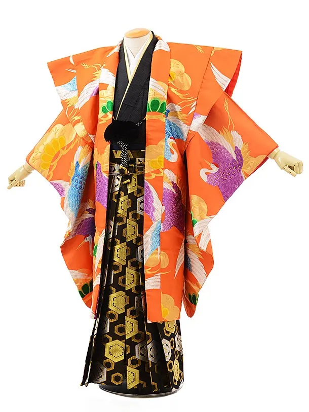 卒業式成人式袴レンタル212オレンジ 多色鶴 松×黒金亀甲(L)