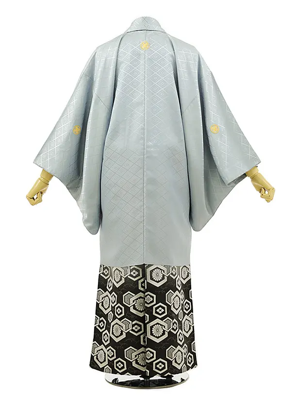 男性袴レンタル0224 シルバーグレー紋付×白黒ぼかし袴
