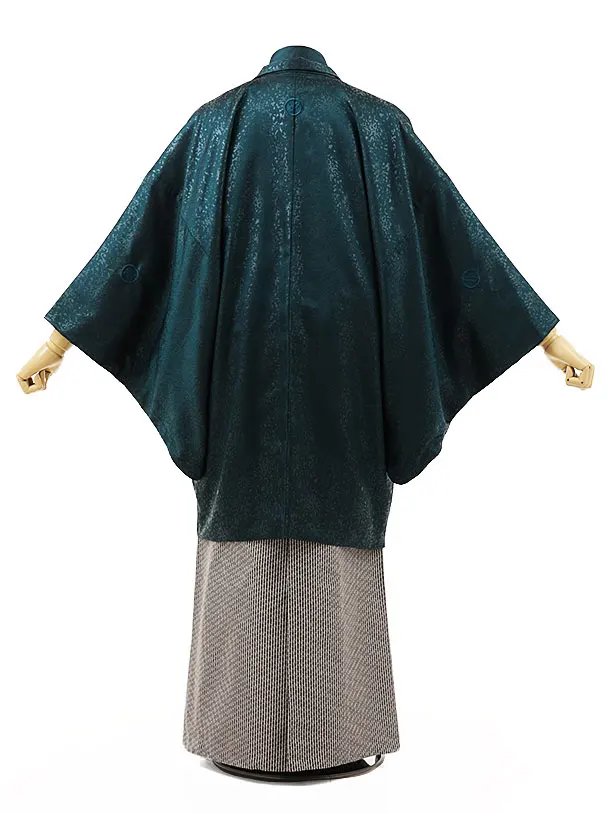 男性袴レンタル0253 ブルーグリーン紋付×ベージュストライプ