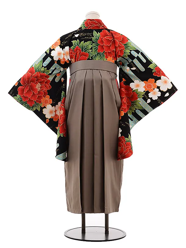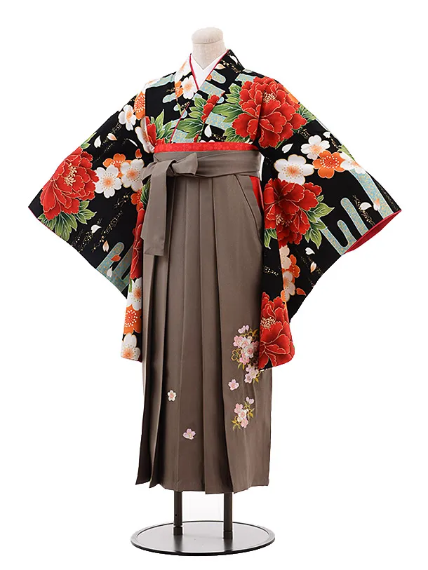 卒業袴レンタルh092黒地ぼたん桜×グレージュ