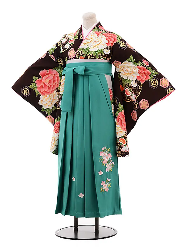 卒業袴レンタルh100濃茶地 ぼたん×ターコイズ