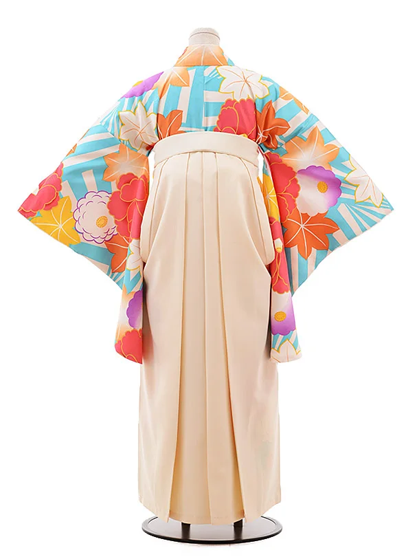 卒業式袴レンタル h129 ターコイズ 白 椿×クリーム袴
