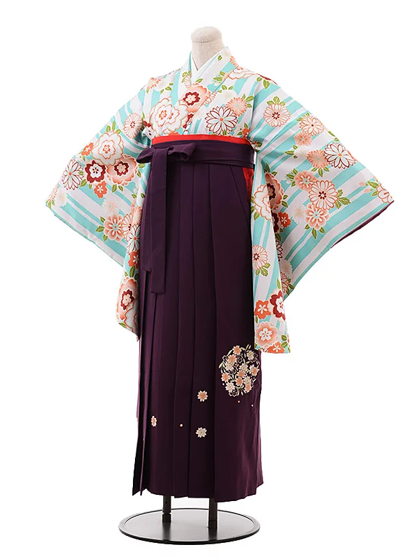 卒業式袴レンタル h146 水色 ストライプ 花×パープル袴