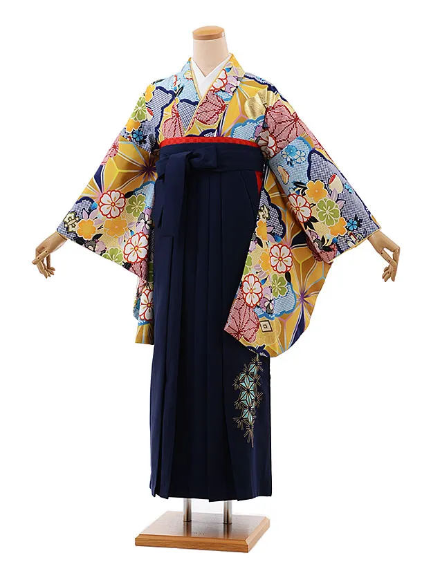 卒業式袴レンタル h177 黄色地 赤バラ×紺袴