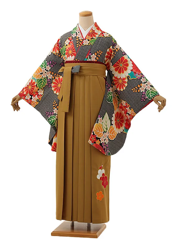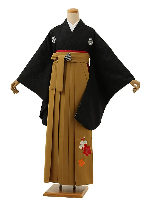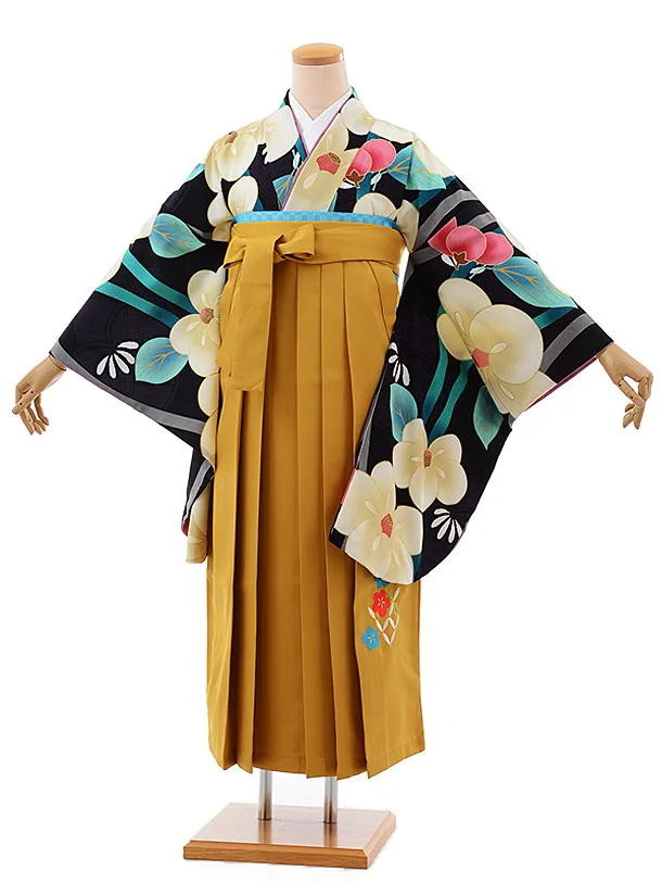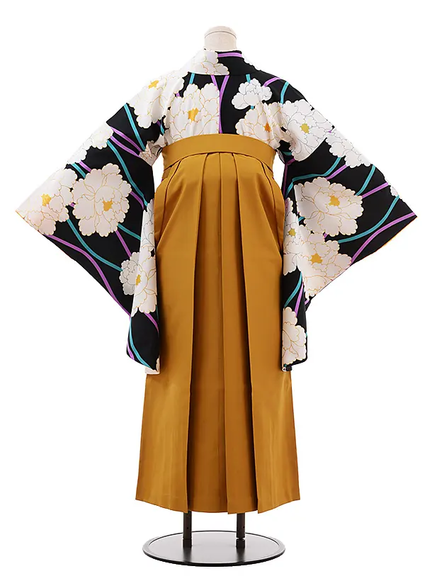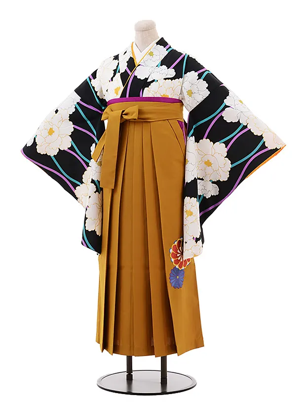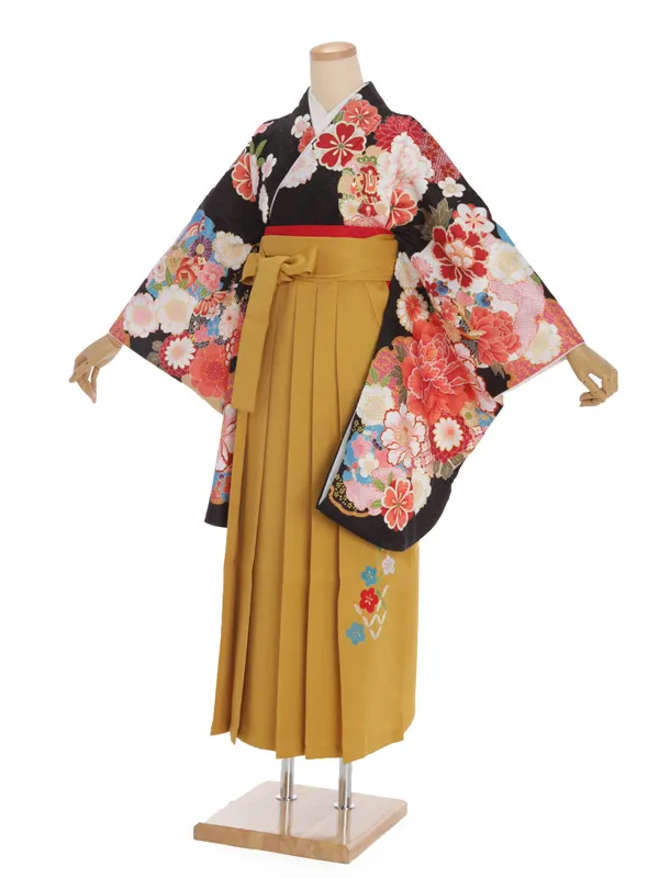 卒業式袴レンタル h220 黒地 ぼたん×からし色袴