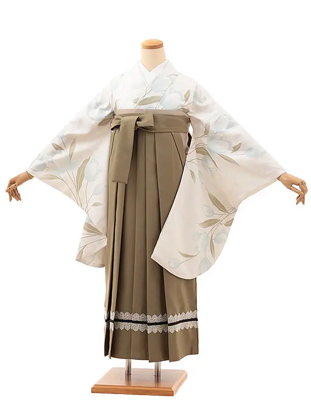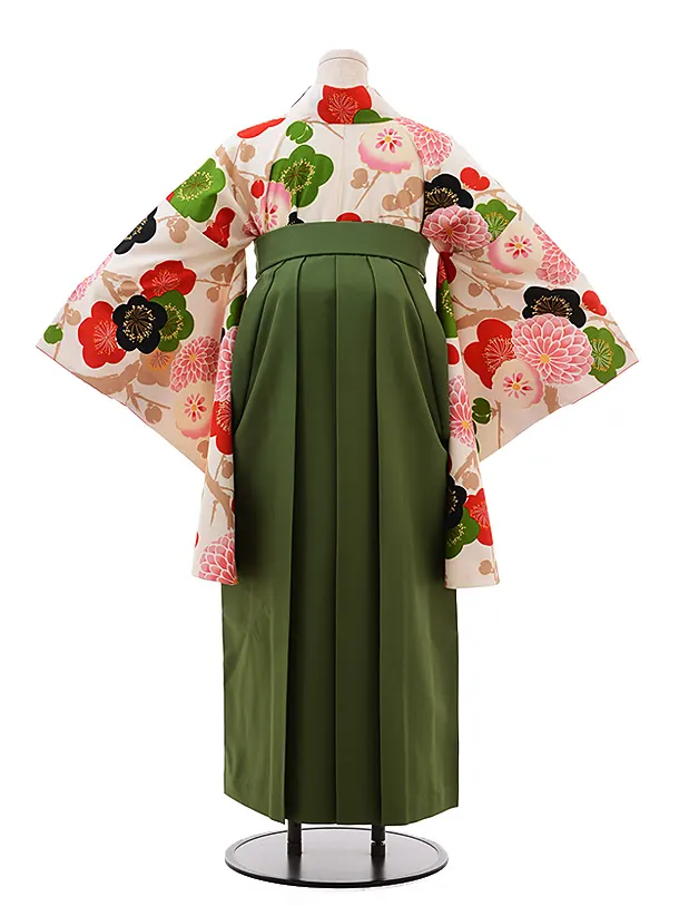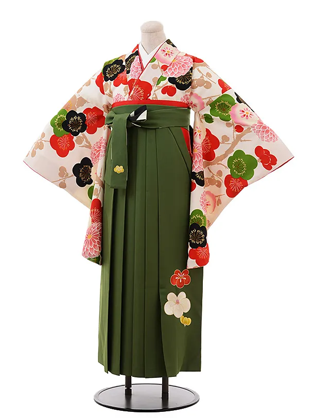 卒業式袴レンタル h242 紅一点 クリーム地 梅×グリーン袴