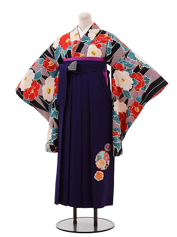 卒業式袴レンタル h244 九重 黒 矢柄 椿×パープル袴