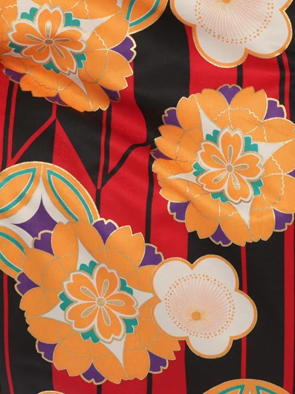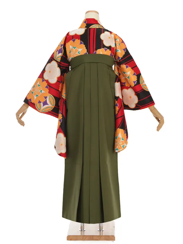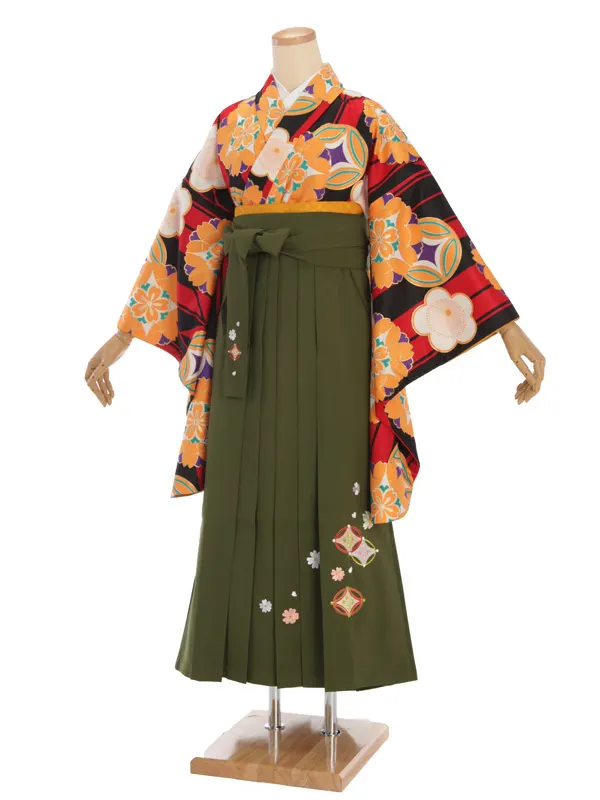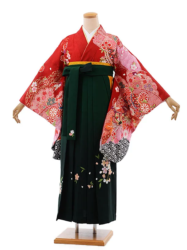 卒業袴レンタルh252 赤 矢羽根に花柄 x グリーン袴