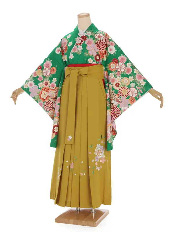 卒業袴レンタルh273 グリーン地 花柄 x からし袴