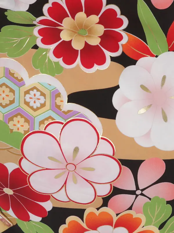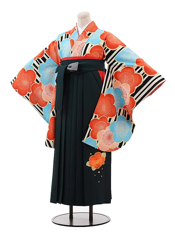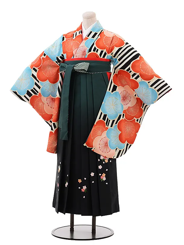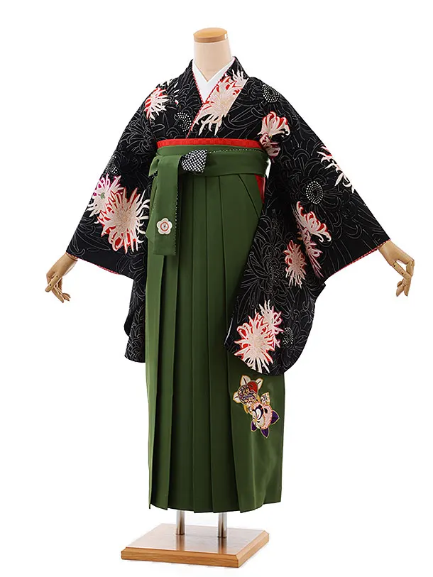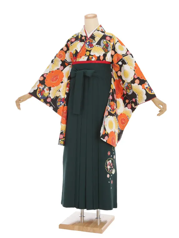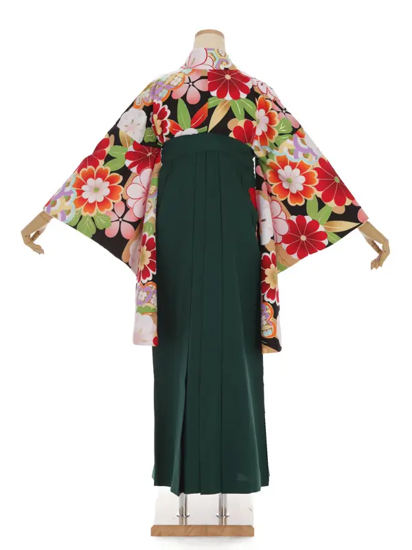 卒業袴レンタルh282 黒地 花柄 x グリーン袴