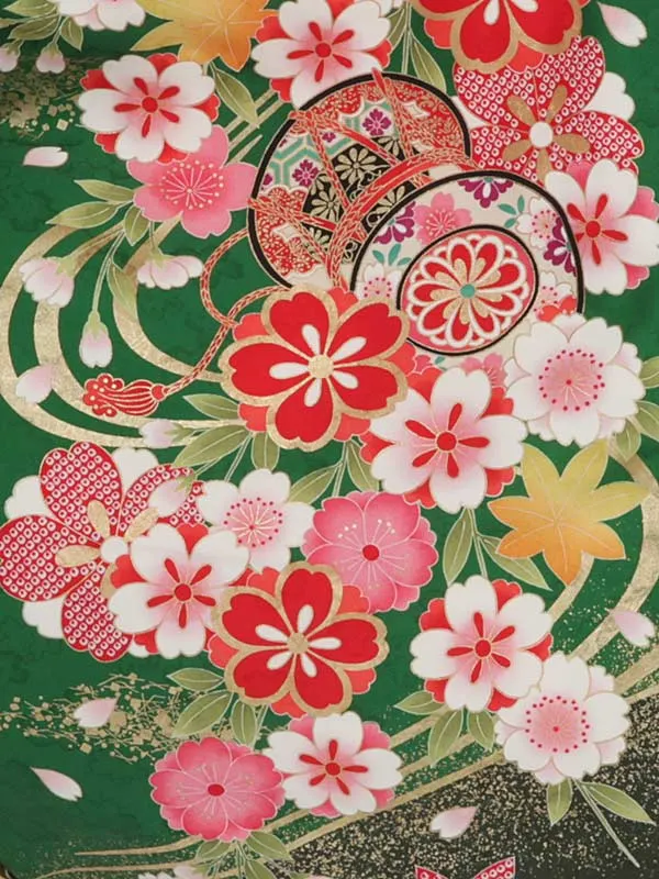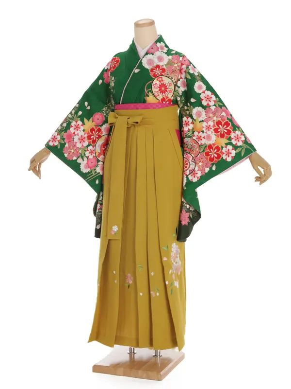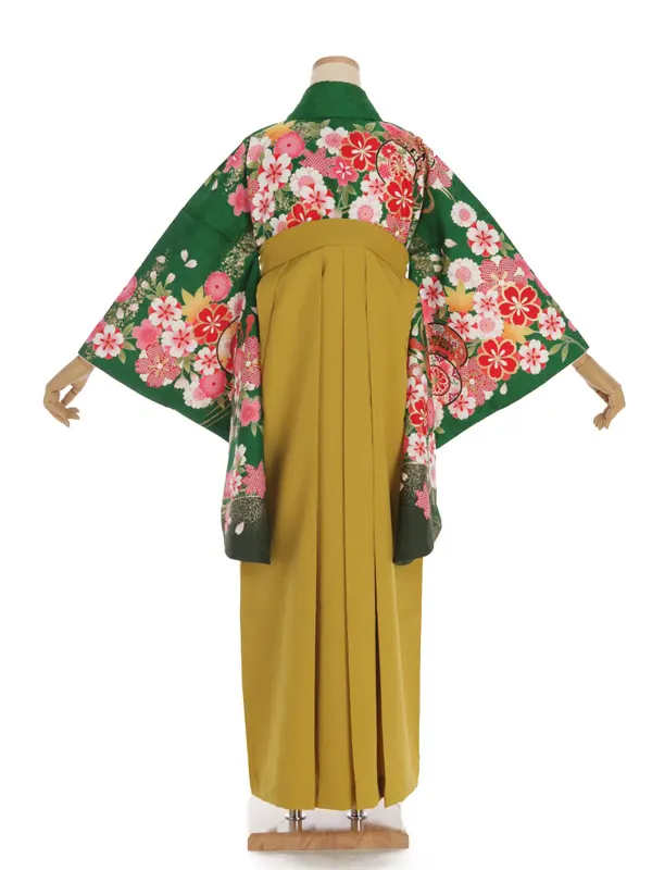 卒業袴レンタルh313 グリーン 花と鼓 x からし袴