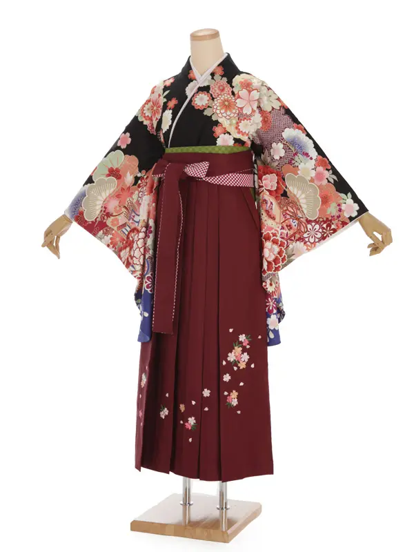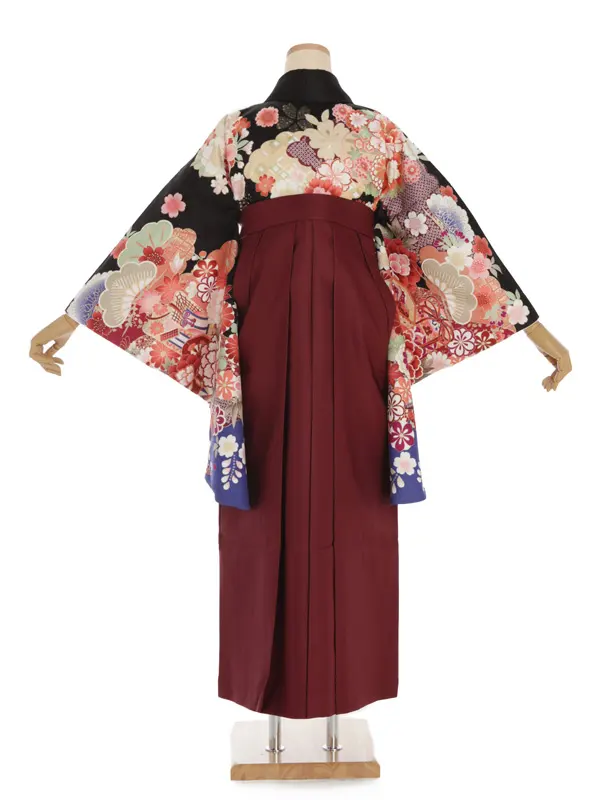 卒業袴レンタルh327 黒地 古典柄 x 赤袴