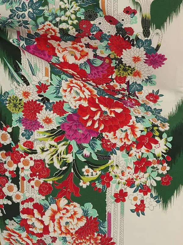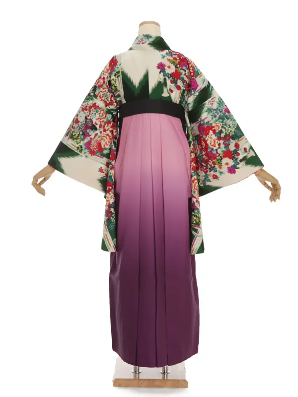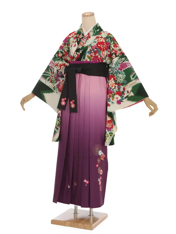 卒業袴レンタルh338 グリーン 矢柄 花 x 紫ぼかし袴