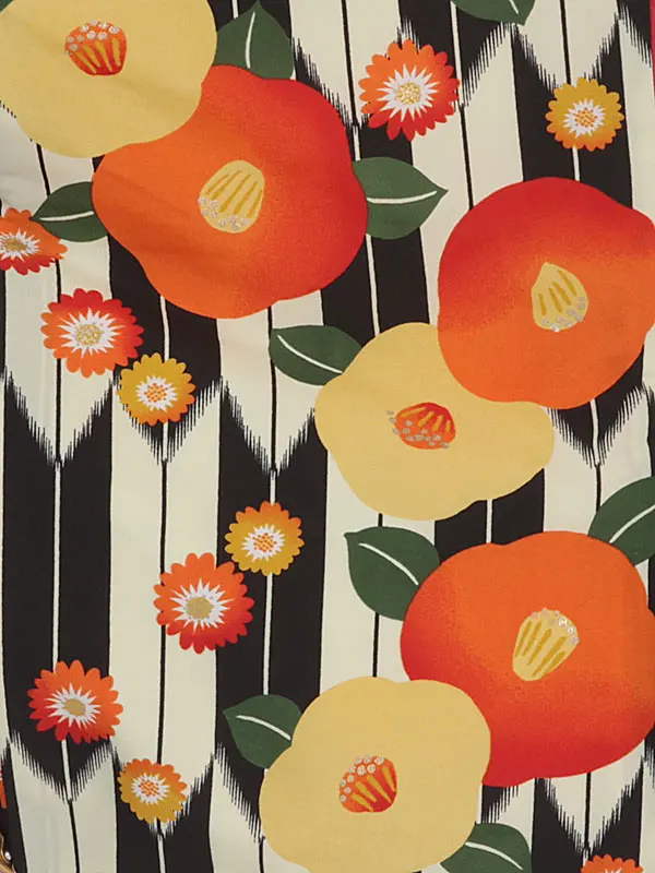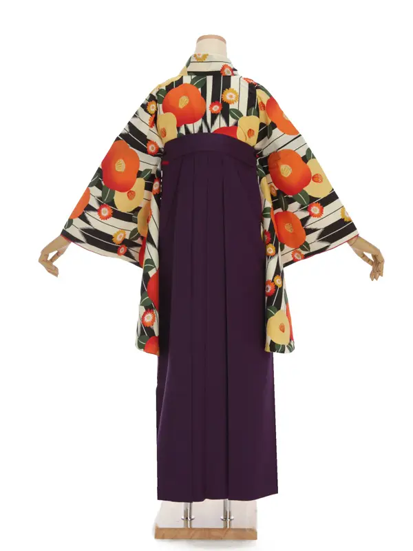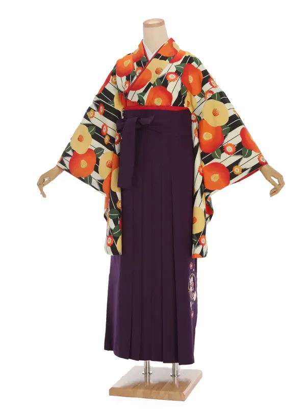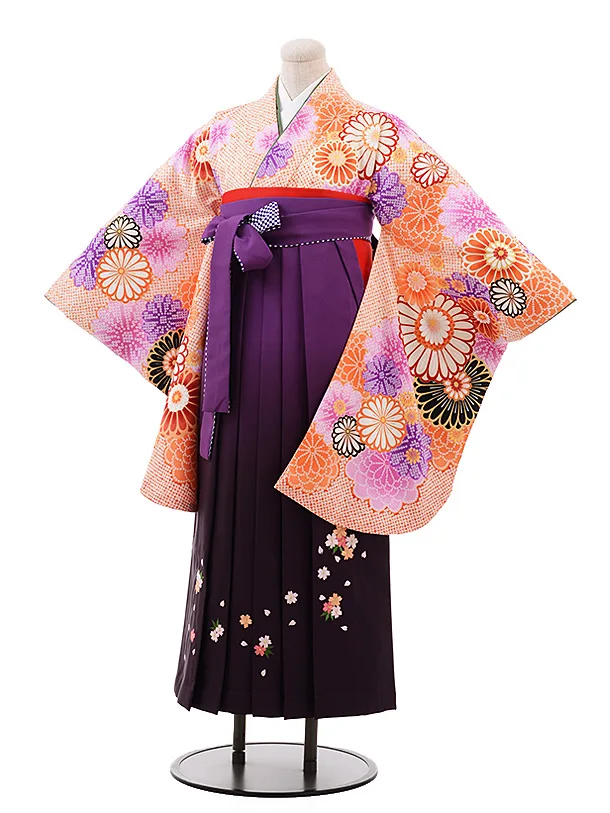 卒業袴レンタルh344 矢柄 オレンジ 椿 x 紫袴