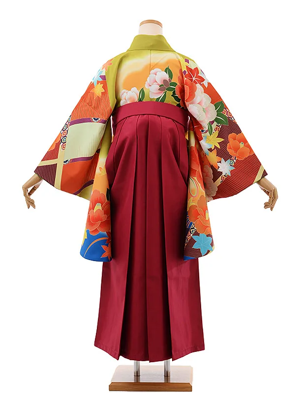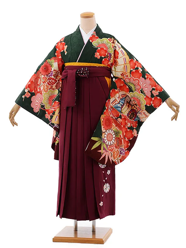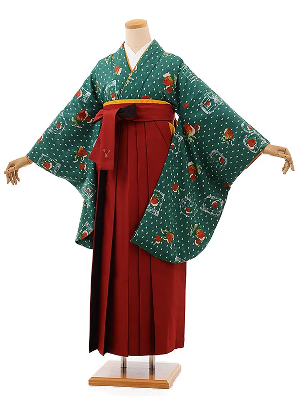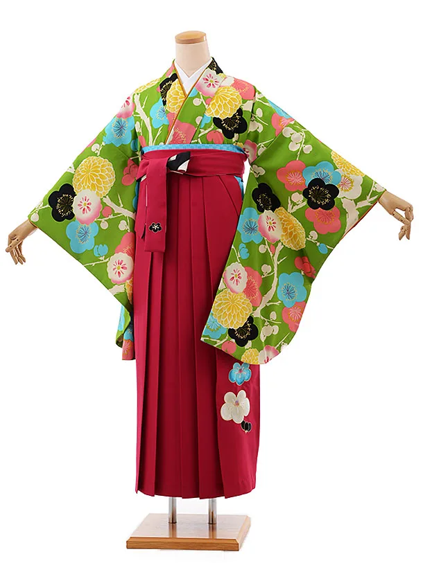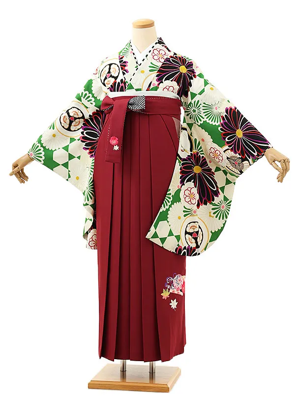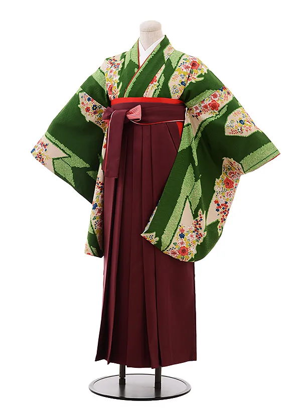 卒業式袴レンタルh354グリーン地八重椿xローズ袴