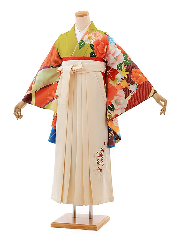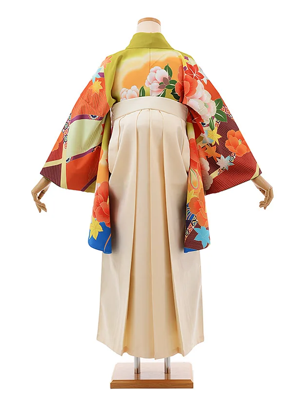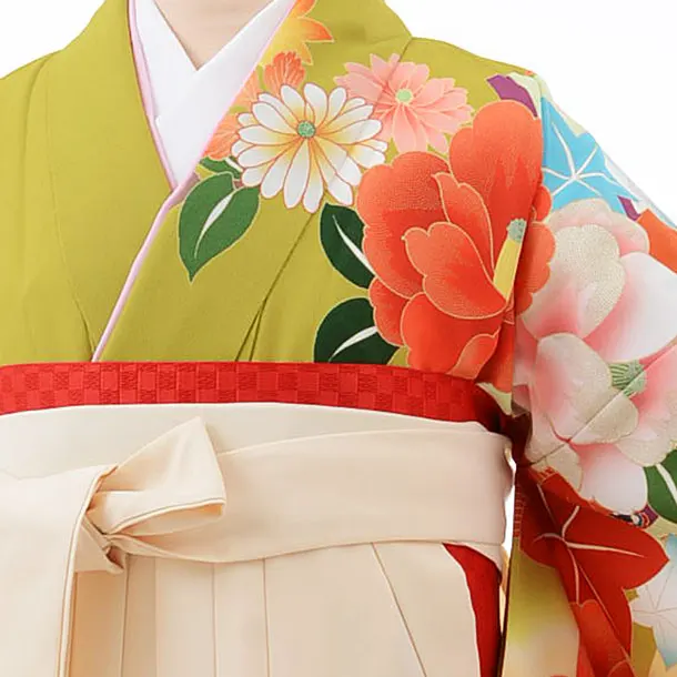 卒業式袴レンタルh355グリーン地八重椿xクリーム袴