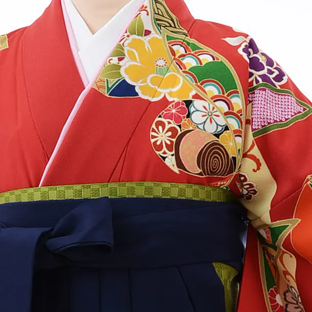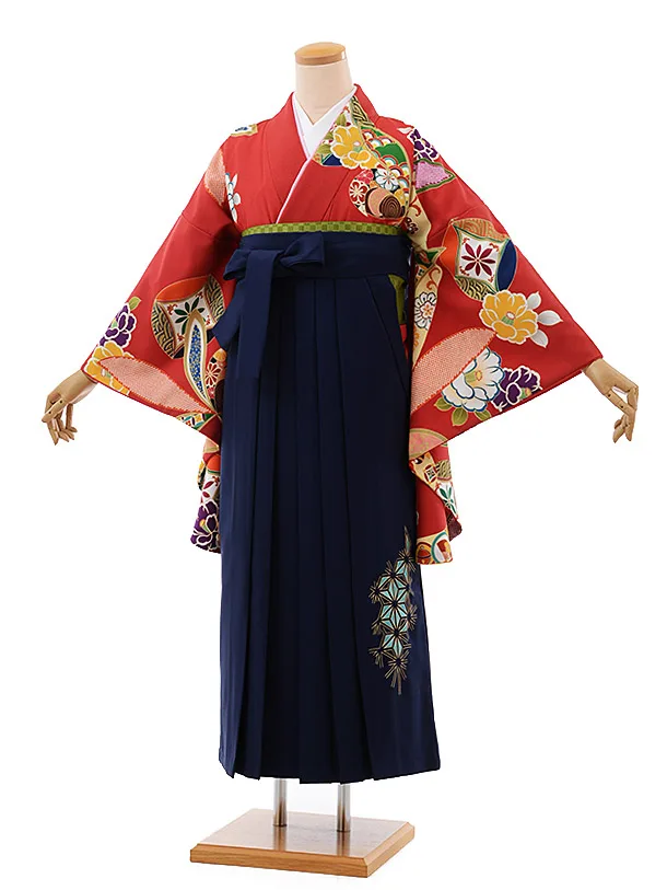 卒業式袴レンタルh357赤地椿七宝×紺袴