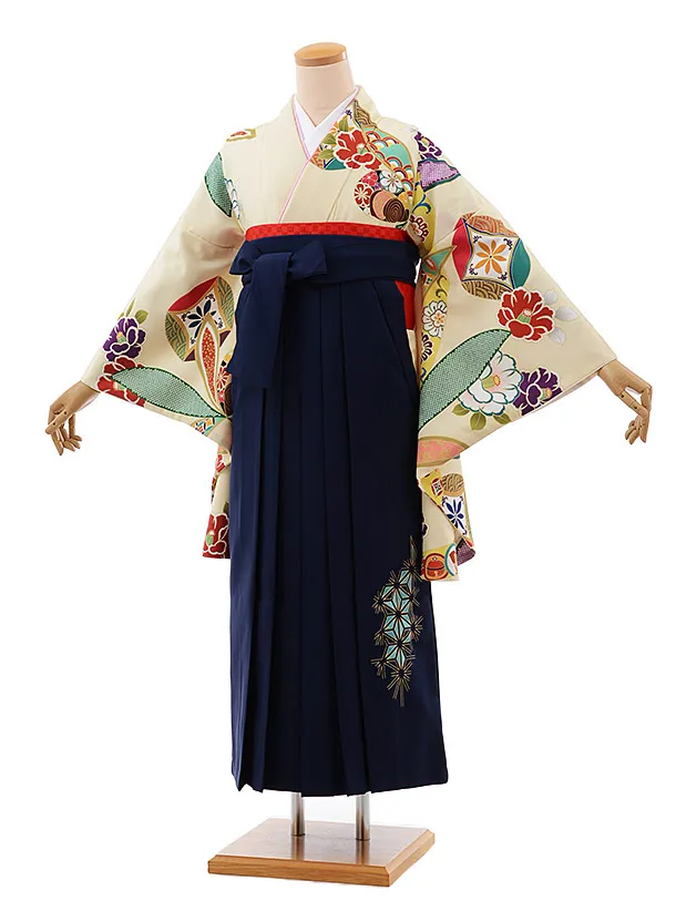 卒業式袴レンタルh359クリーム地椿七宝×紺袴