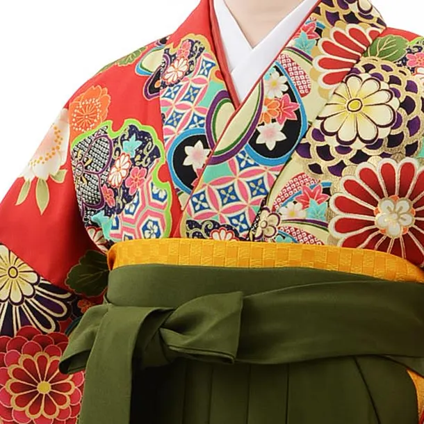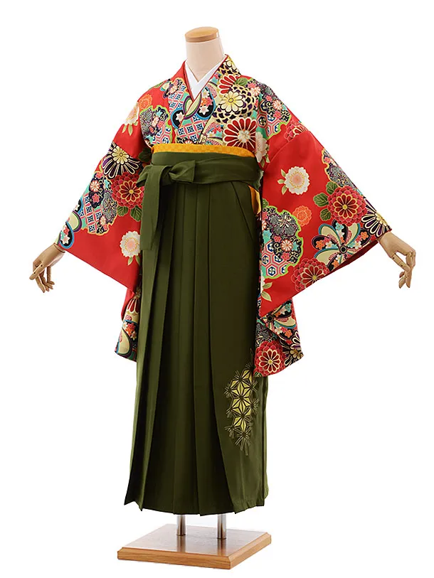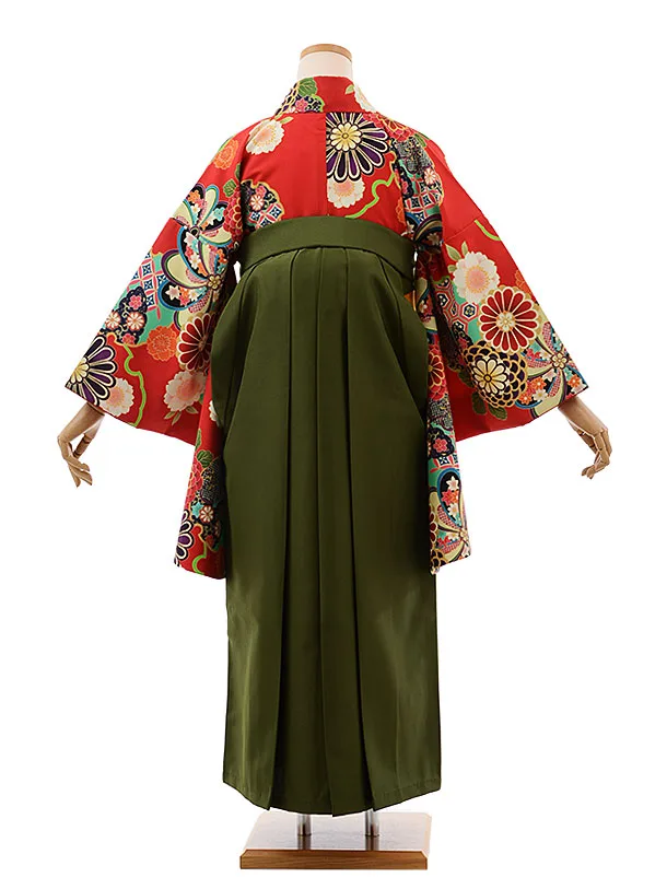 卒業式袴レンタルh366赤地菊×抹茶色袴