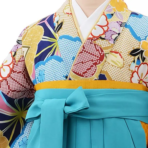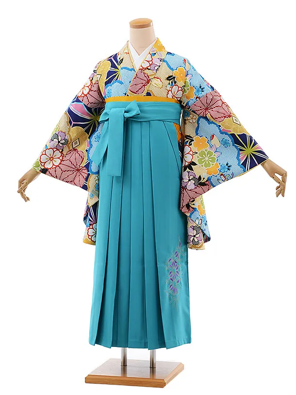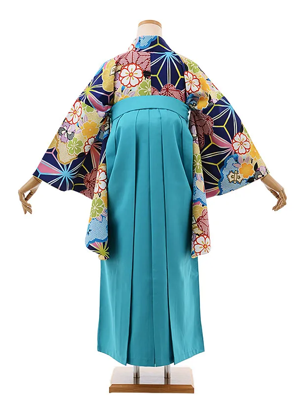 卒業式袴レンタルh367紺地麻の葉桜×ターコイズ袴