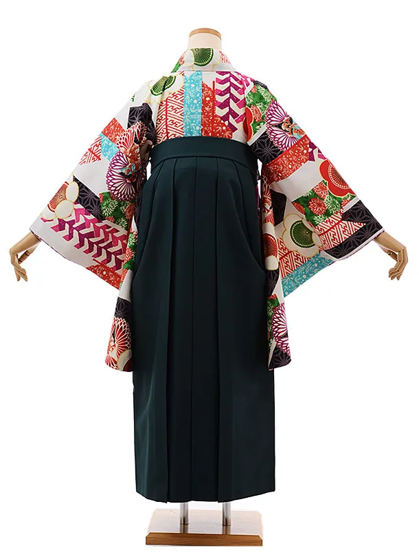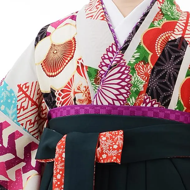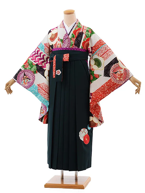 卒業式袴レンタルh397はいばら白地矢羽根に梅×グリーン袴