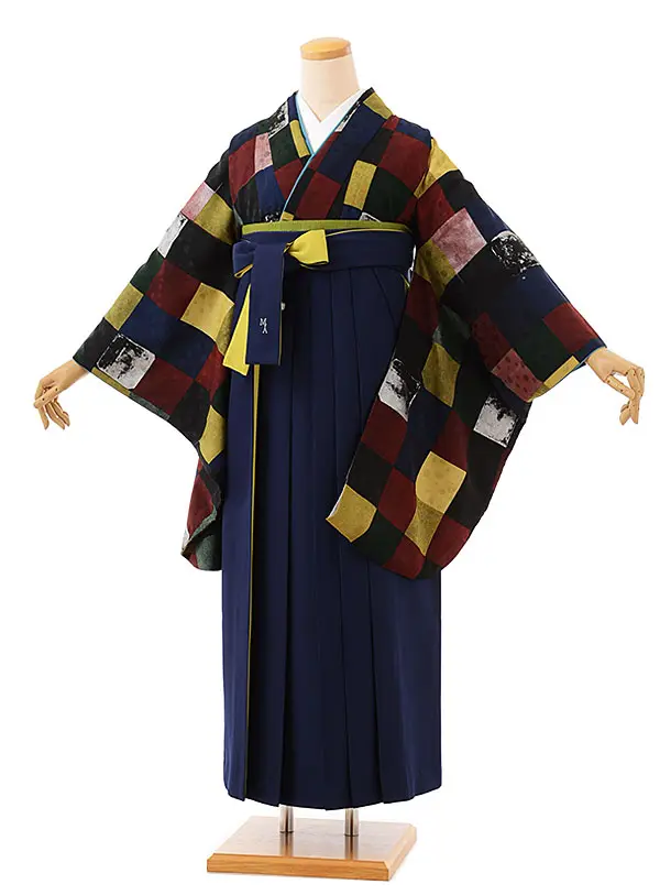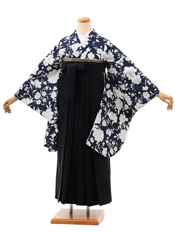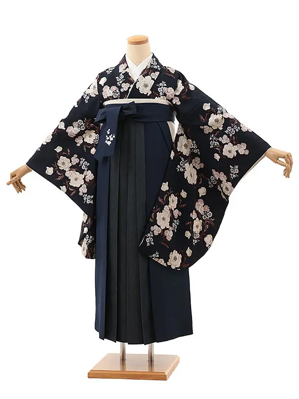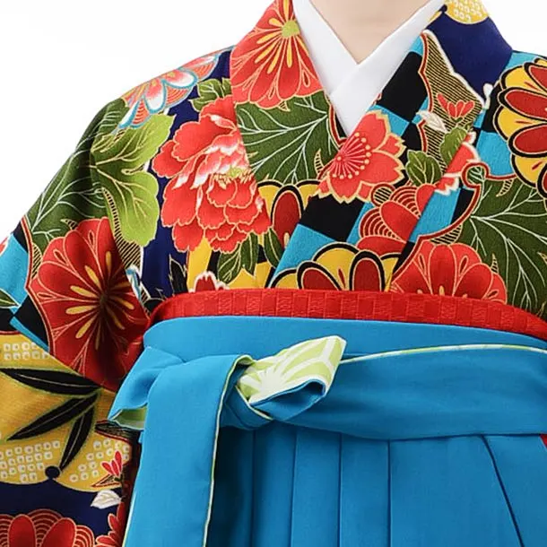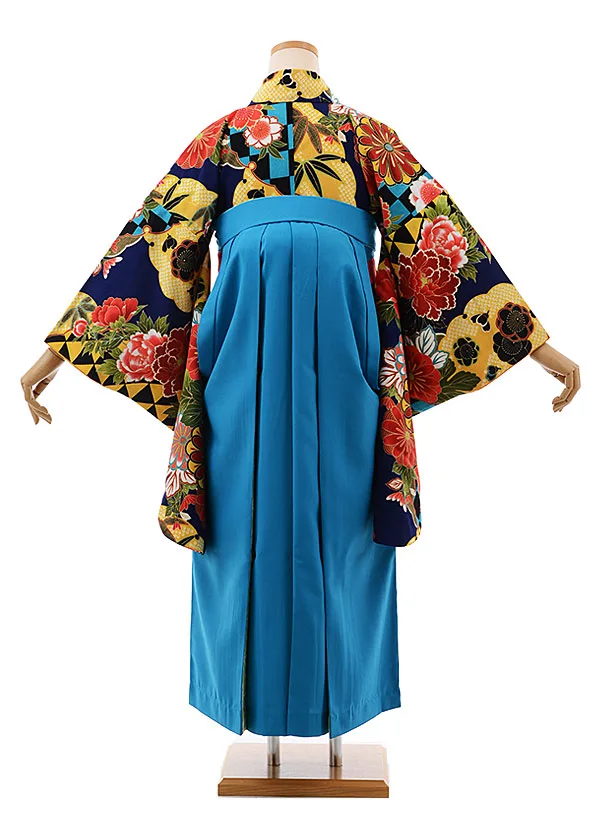 卒業式袴レンタルh432紺地菊ぼたんxターコイズ袴