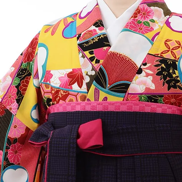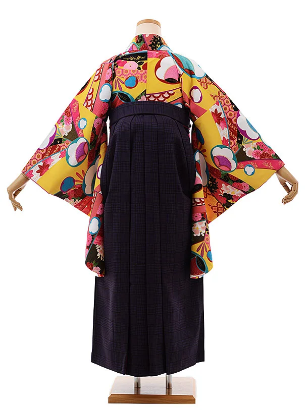 卒業式袴レンタルh436黄色地梅xパープルグレンチェック袴