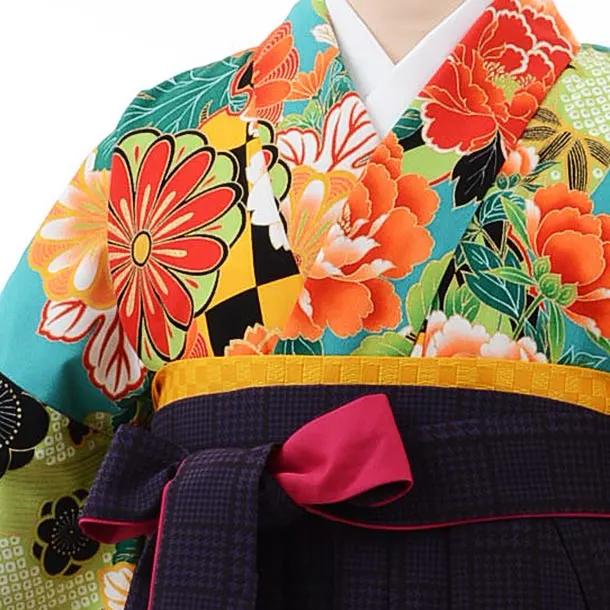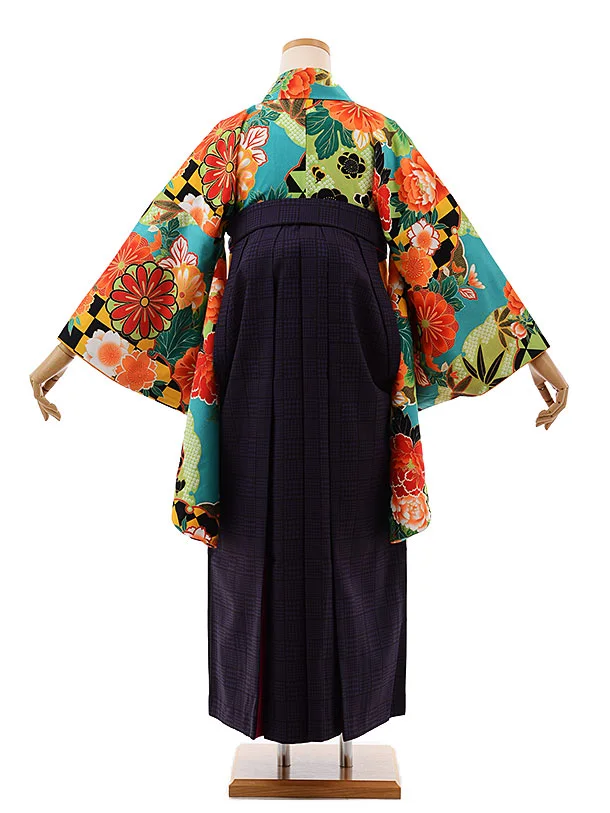 卒業式袴レンタルh437ターコイズ地菊ぼたん×紫チェック袴