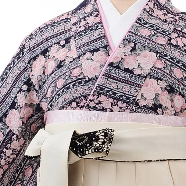 卒業式袴レンタルh447ラフィネモカゴブラン紺ピンク×レース入り袴