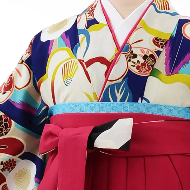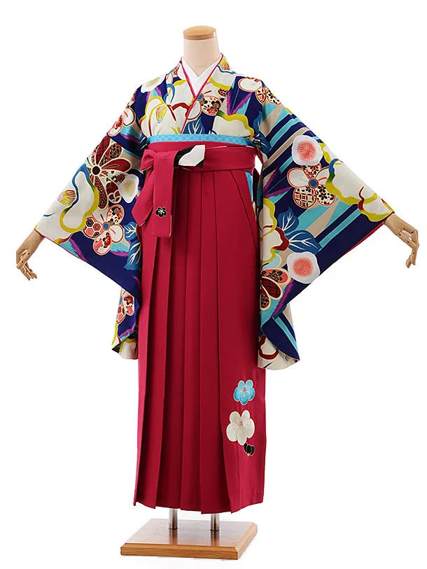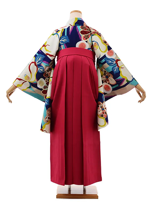 卒業式袴レンタルh450紅一点紺地矢柄椿×ローズ袴