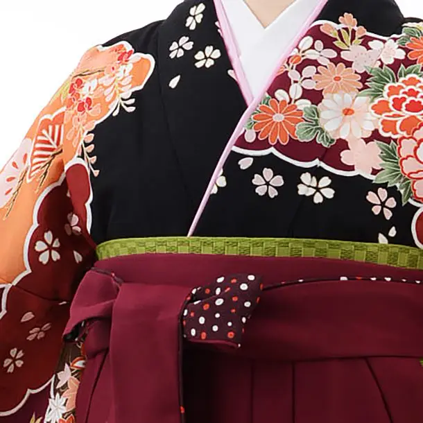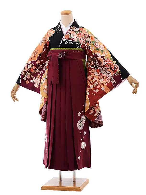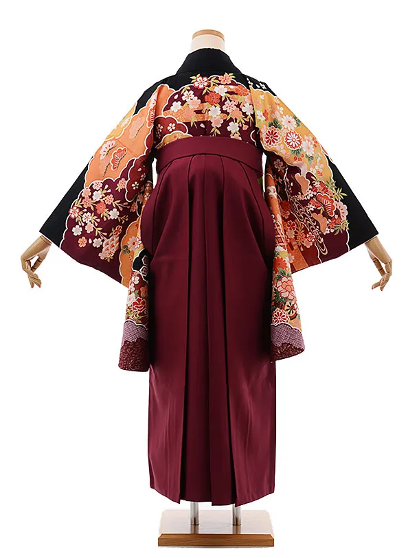 卒業式袴レンタルh470黒地雲取りに花×エンジ袴