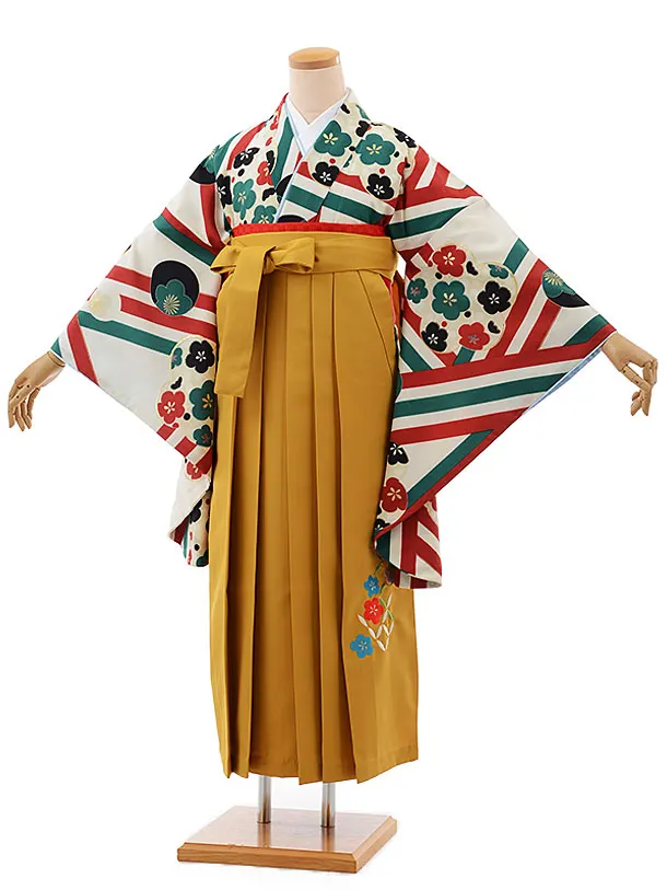 卒業式袴レンタルh537クリーム地赤緑梅xからし袴