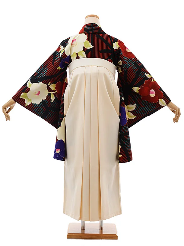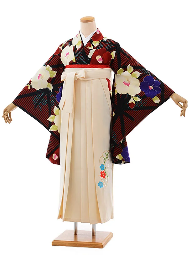 卒業式袴レンタルh554JAPANSTYLE黒赤ストライプ椿×白袴