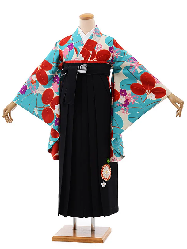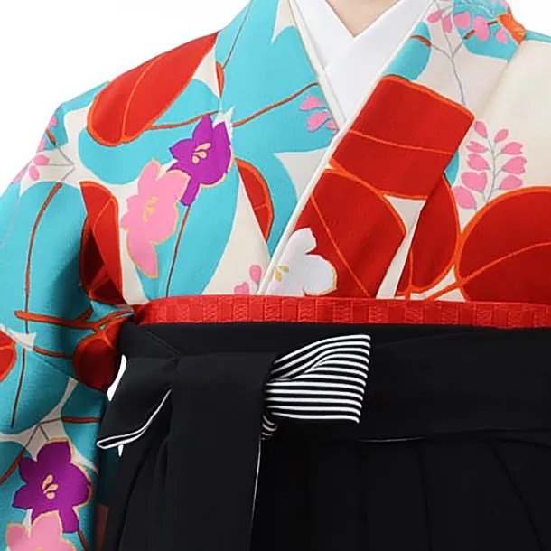 卒業式袴レンタルh557紅一点白地水色赤花×黒袴