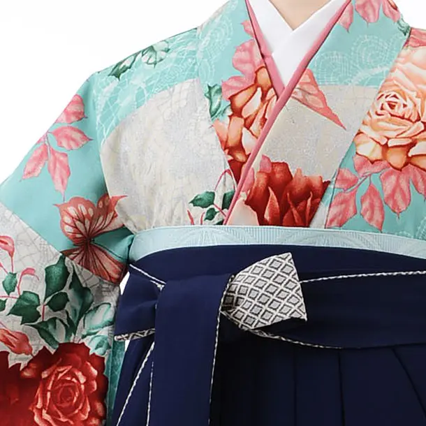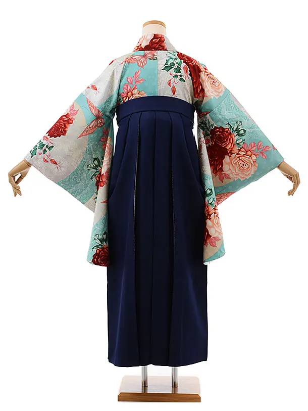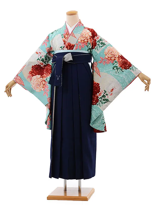卒業式袴レンタルh564モダンアンテナターコイズバラ×紺袴