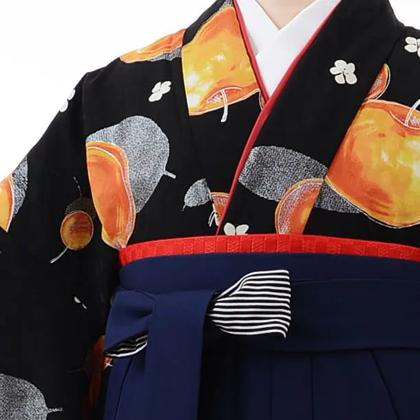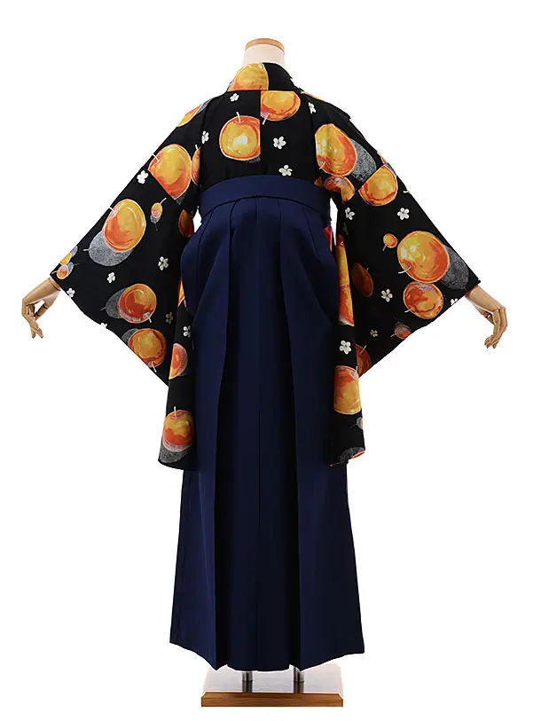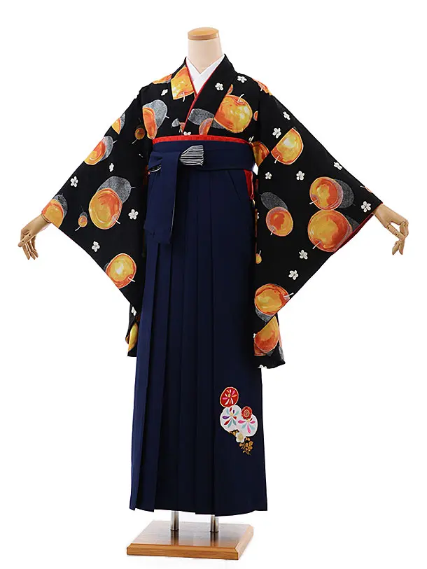 卒業式袴レンタルh576モダンアンテナ黒地りんご×紺袴