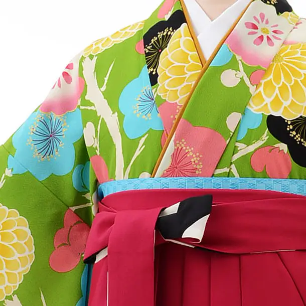卒業式袴レンタルh589紅一点グリーン地梅菊×ローズ袴