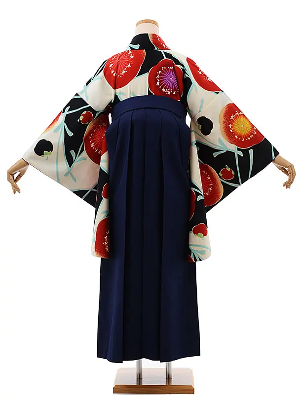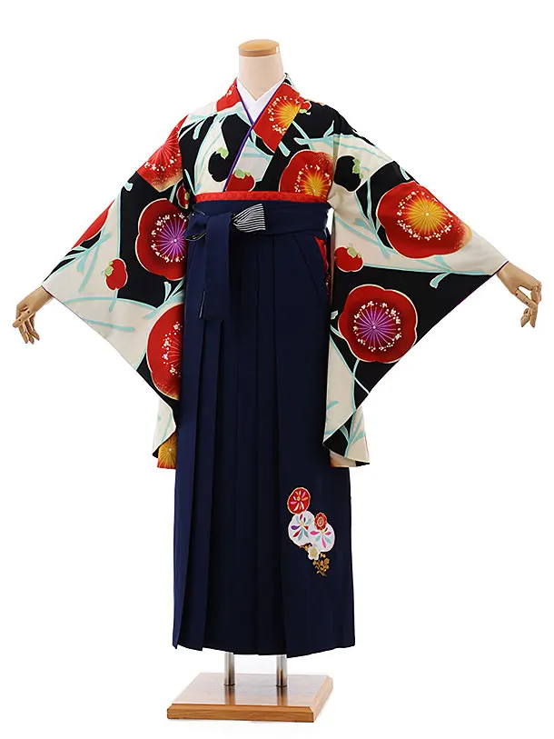 卒業式袴レンタルh597紅一点黒白梅×紺袴