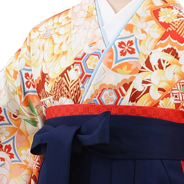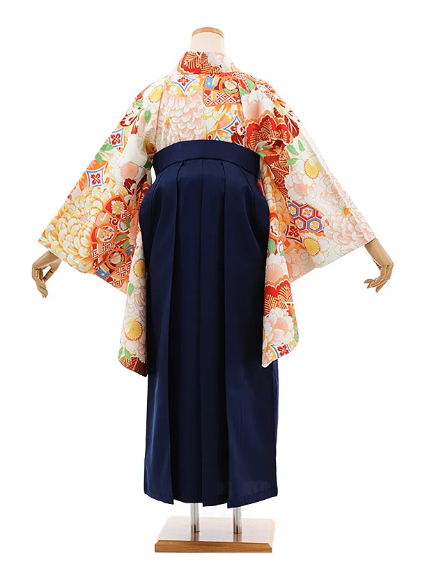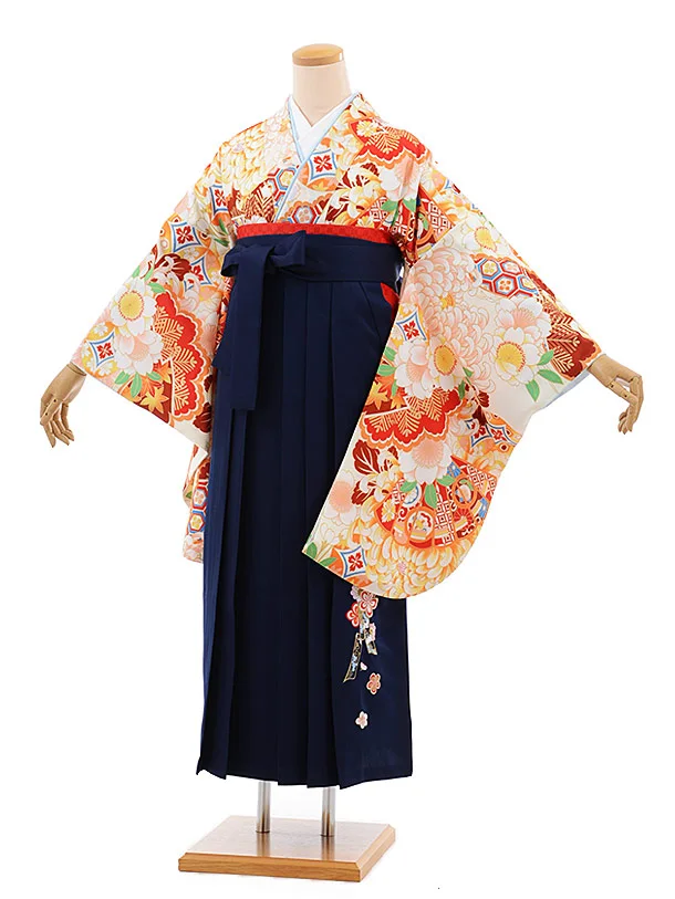 卒業袴レンタルh639 ひいな 白地 菊 桜 扇x紺袴