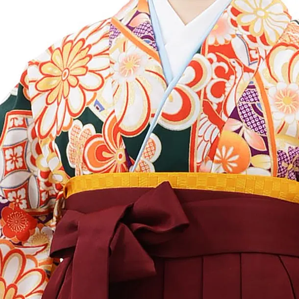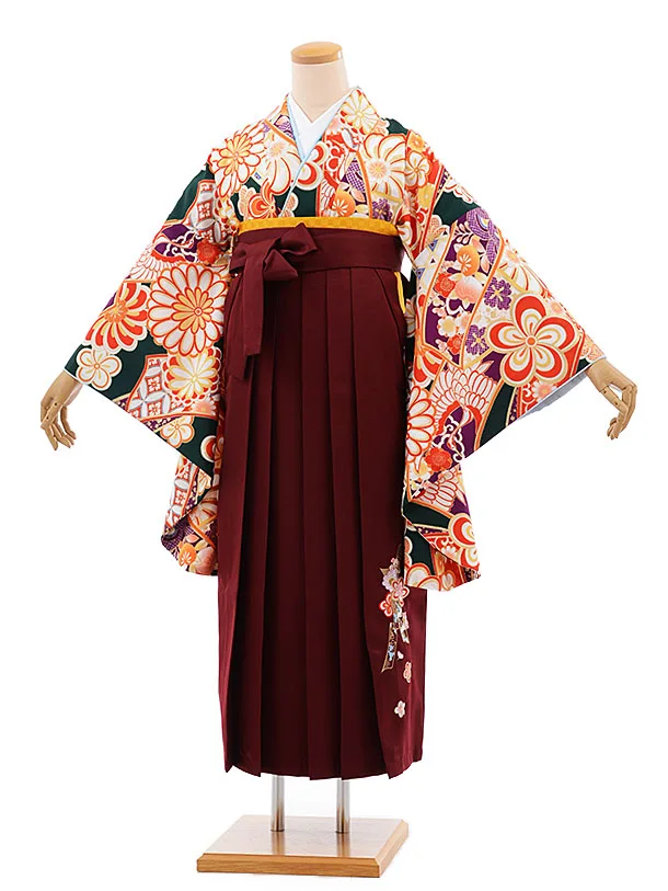 卒業袴レンタルh645 ひいな グリーン地 菊 鶴xエンジ袴
