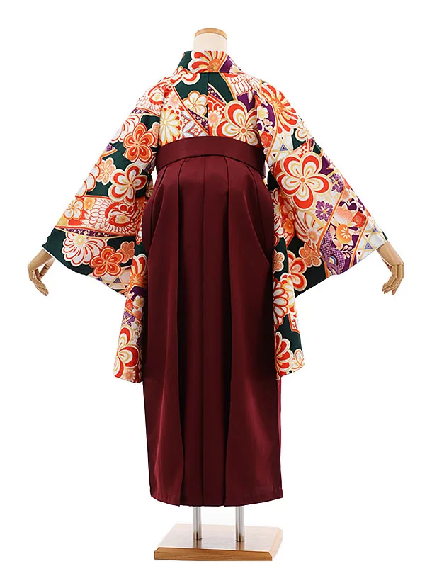 卒業袴レンタルh646 ひいな グリーン地 菊 鶴xエンジ袴