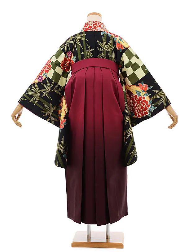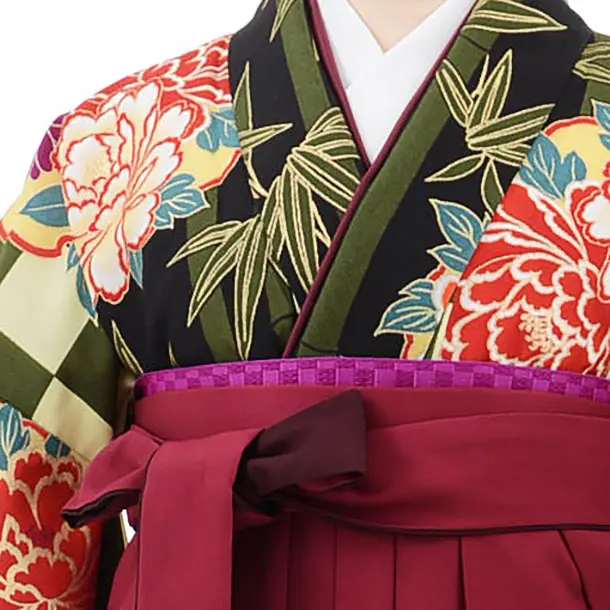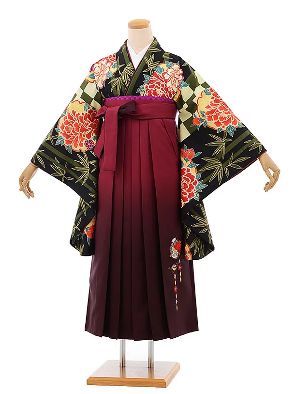 卒業袴レンタルh656 黒地 市松 ぼたん x ローズ袴