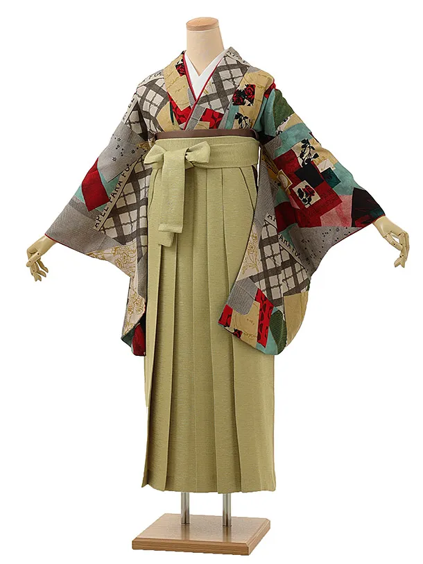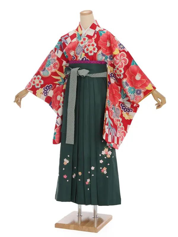 卒業袴レンタルh663 エンジ色地 市松 ぼたん x グリーン袴