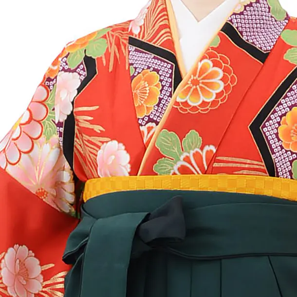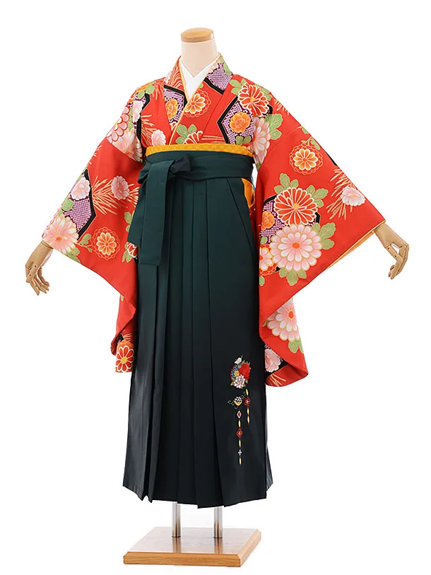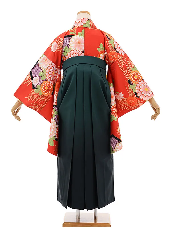 卒業袴レンタルh668 赤地 亀甲 菊 x グリーン袴