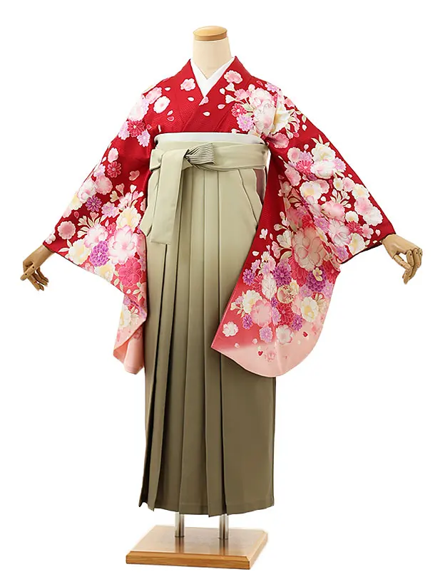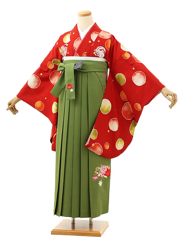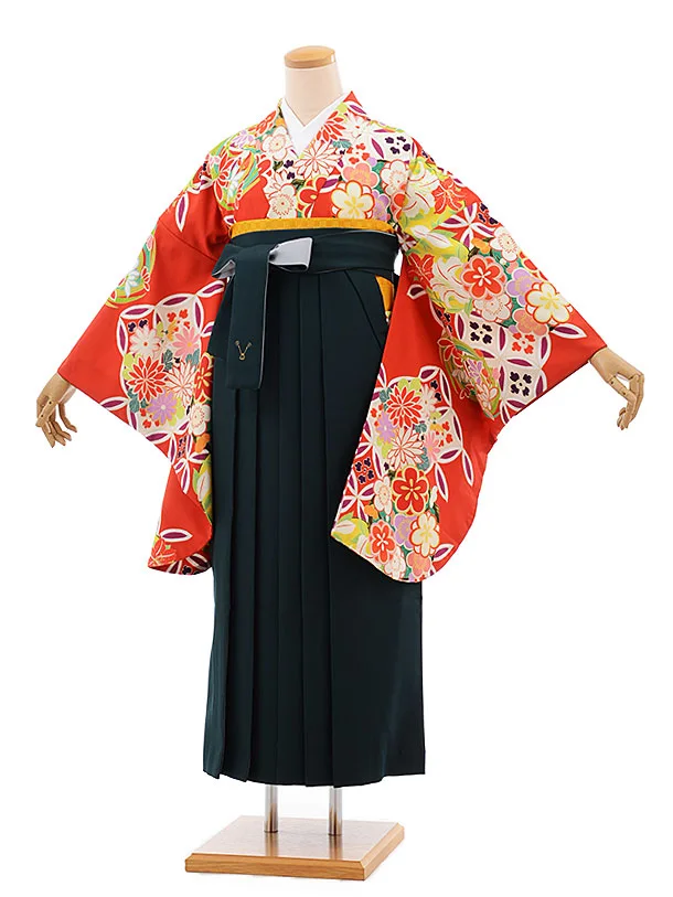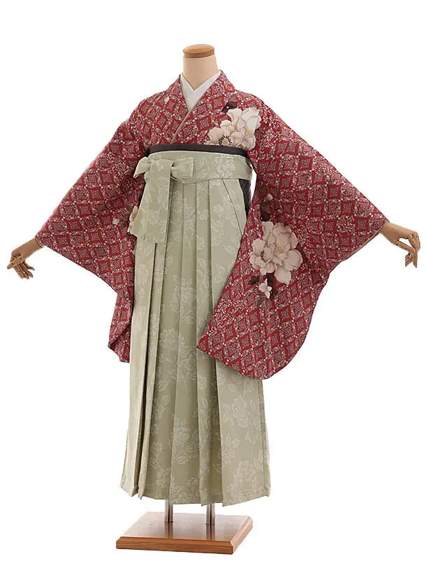 卒業袴レンタルh670 赤地 亀甲 菊 x グリーン袴