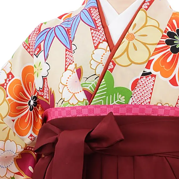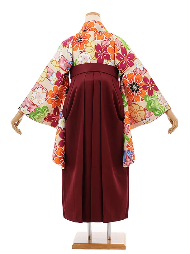 卒業袴レンタルh671 ベージュ地 梅桜 x エンジ袴