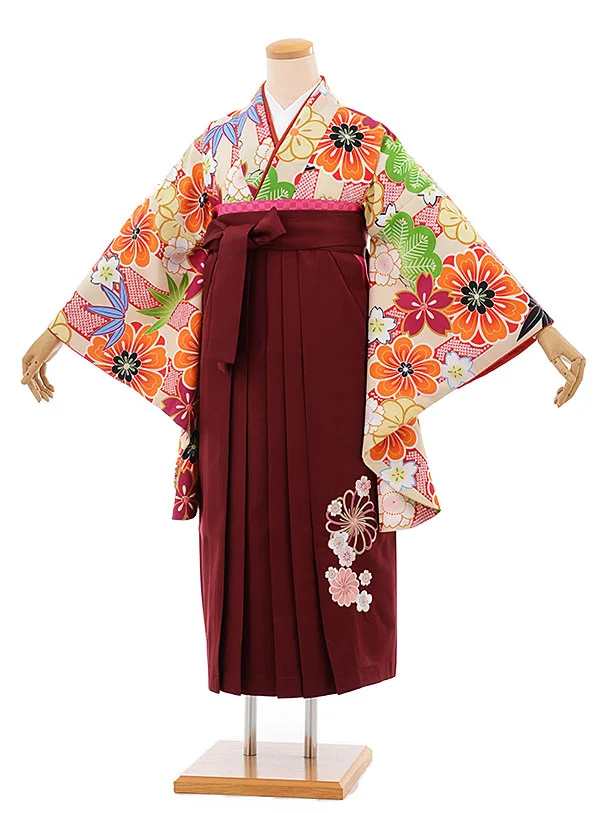卒業袴レンタルh672 ベージュ地 梅桜 x エンジ袴