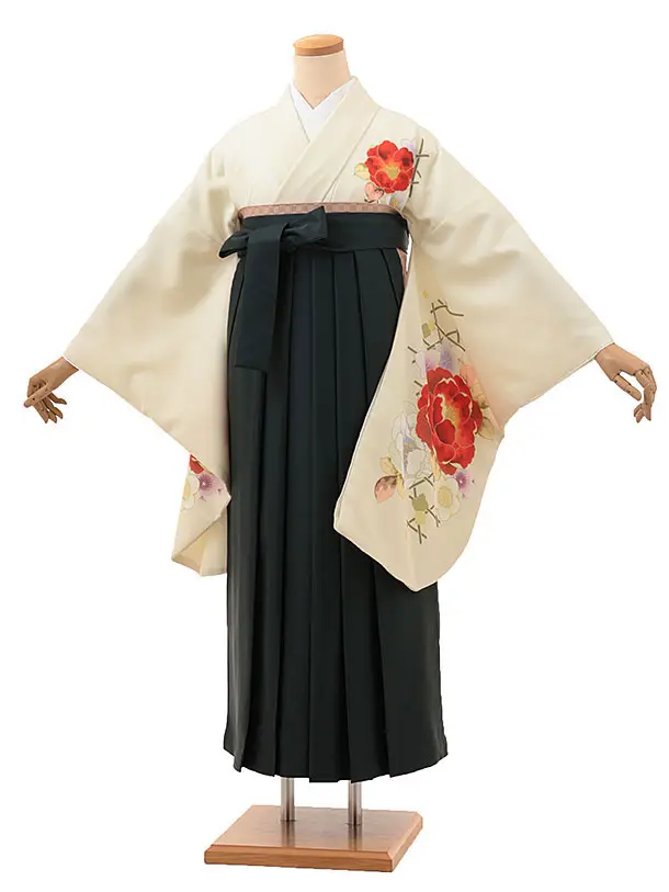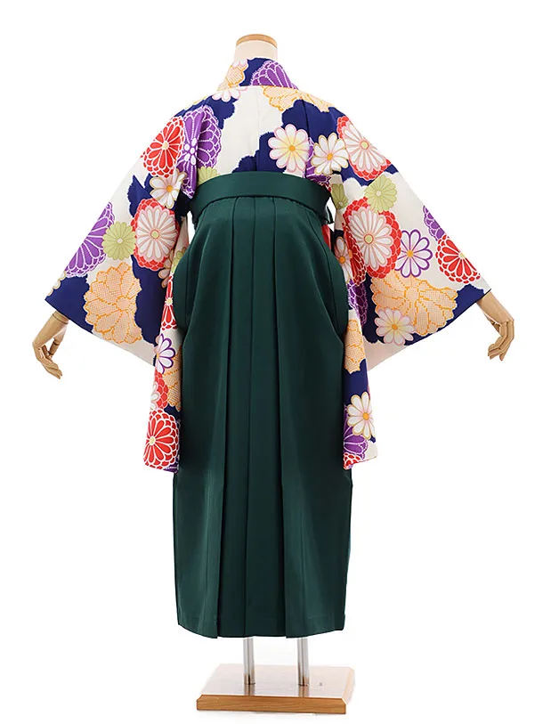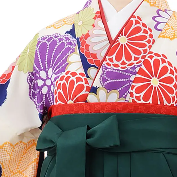 卒業袴レンタルh678 クリーム色地 菊 x グリーン袴