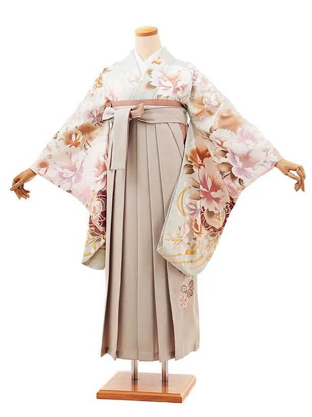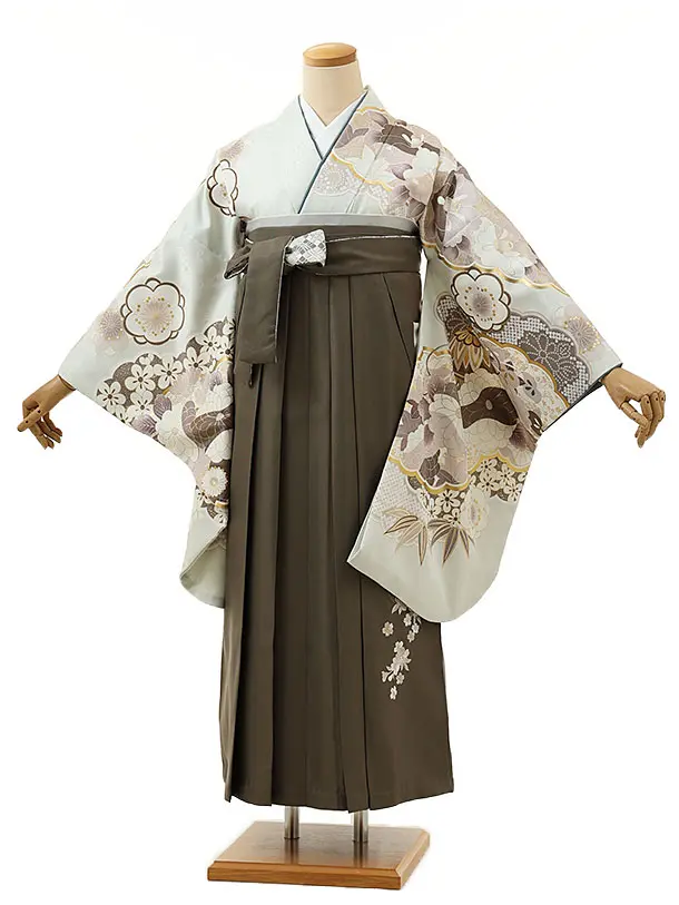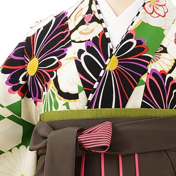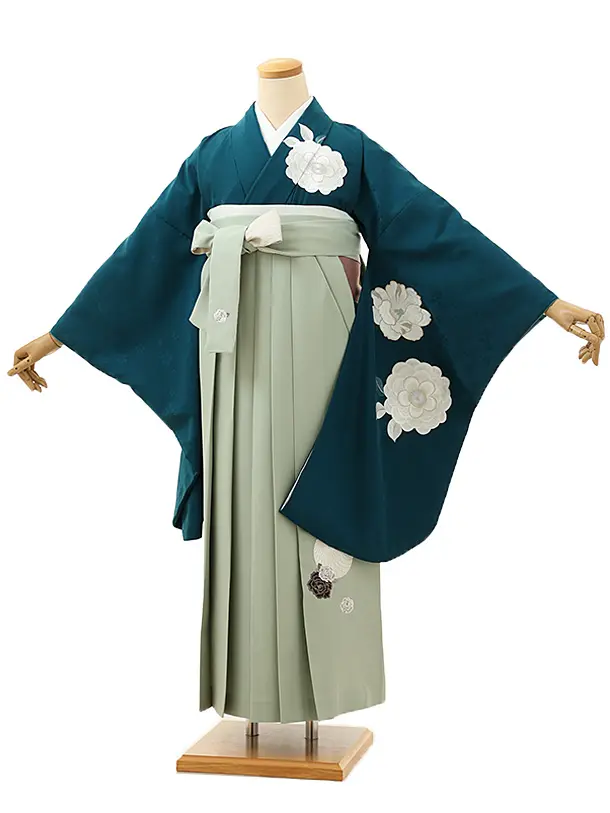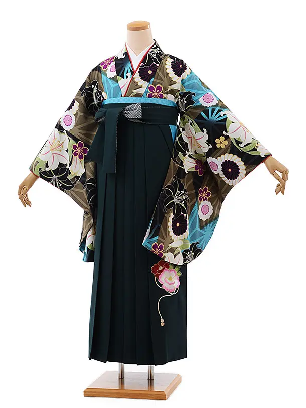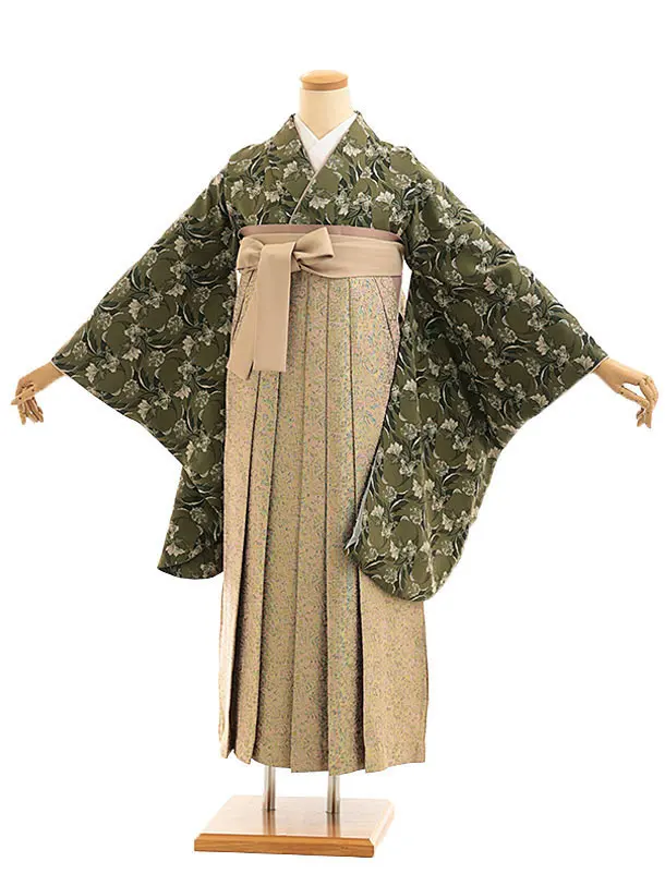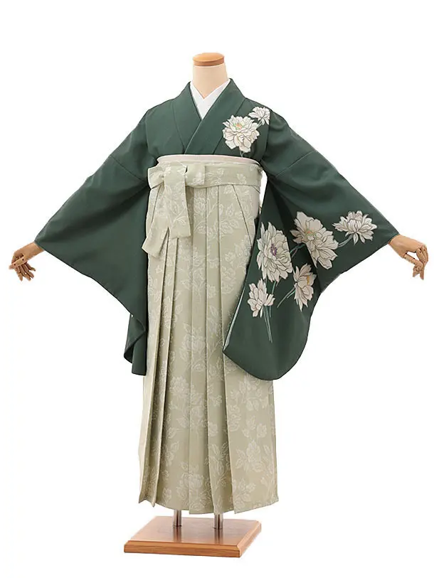卒業式袴レンタルh756 グリーン菊xカーキピンク袴