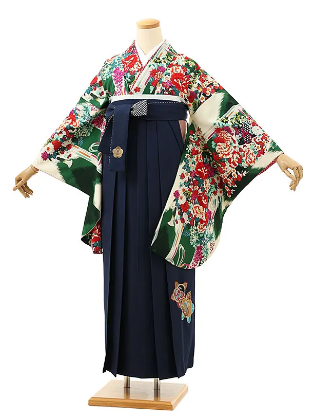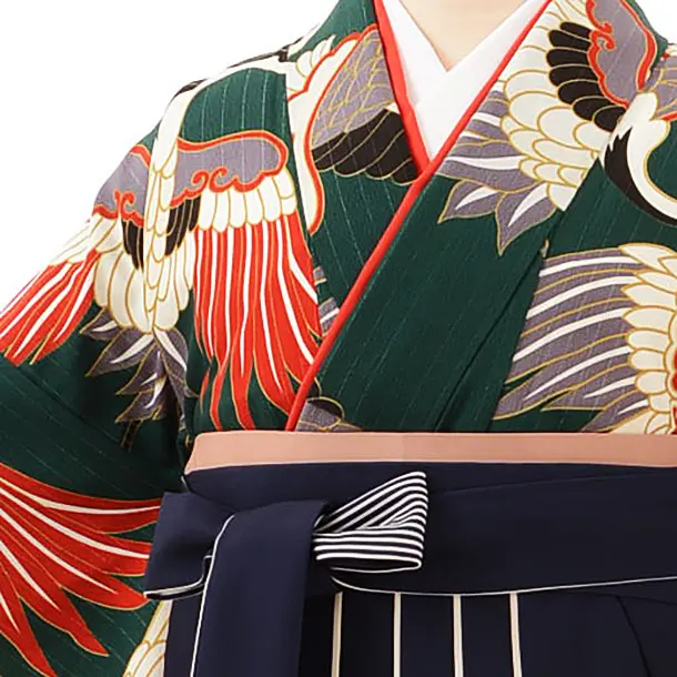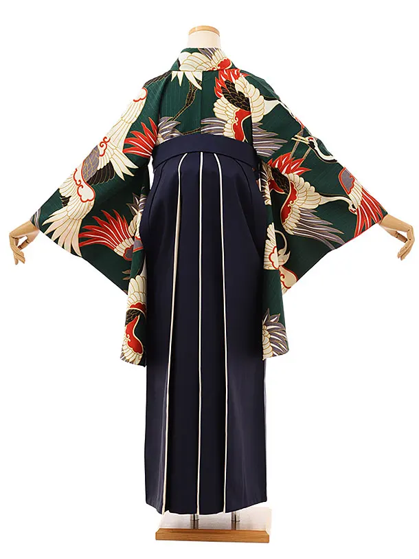 卒業式袴レンタルh757 グリーン鶴x紅白袴
